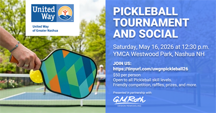 The United Way of Greater Nashua invites you to join us for a day filled with fun and friendly competition! Pickleball is one of today’s hottest trends, and it’s a fantastic way to stay active. This exciting event is open to all skill levels and will feature raffles, prizes, and much more!
